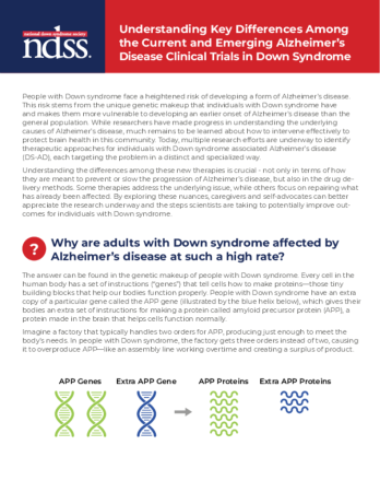 People with Down syndrome face a heightened risk of developing a form of Alzheimer’s disease. Multiple research efforts are underway to identify therapeutic approaches for individuals with Down syndrome associated Alzheimer’s disease (DS-AD), each targeting the problem in a distinct and specialized way. Please download our free guide, Understanding Key Differences Among the Current and Emerging Alzheimer’s Disease Clinical Trials in Down Syndrome, to learn more.