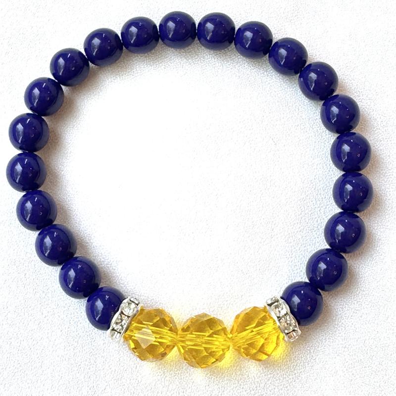 Handcrafted loom ornament designed yellow and blue to symbolize Down Syndrome awareness, decorated with a blue resin star charm.