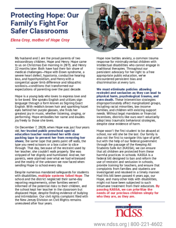 The toolkit below is intended to support advocates who wish to get involved with restraint and seclusion advocacy efforts at the federal level. Resources included in the toolkit are intended to be shared with elected officials and their staff and may include facts and statistics that are new or upsetting to some community members. If you would like to contact a member of our policy team about the information found in these resources, please email policy@ndss.org.