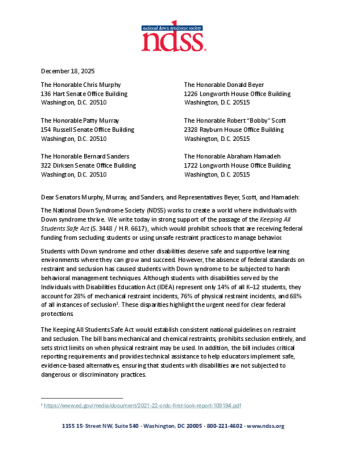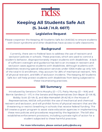At the federal level, NDSS supports the Keeping All Students Safe Act (KASSA). This bill would prohibit the use of mechanical restraint, chemical restraint, and seclusion. KASSA will also limit instances in which physical restraint can be used, allowing it only when there is an imminent threat of physical harm to others in the classroom. This bill will direct the Department of Education to give grants to state education agencies to provide training to faculty on alternatives to restraint and seclusion, and to collect more data.
