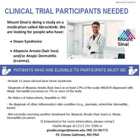 Researchers are doing a study on a medication called Abrocitinib. They are looking for people who have Down syndrome and Alopecia Areata (hair loss) and/or Atopic Dermatitis (eczema).