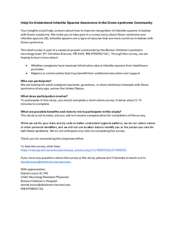 Your insights could help researchers learn about how to improve recognition of infantile spasms in babies with Down syndrome. Researchers invite you to take part in a survey study about Down syndrome and infantile spasms (IS). Infantile spasms are a type of seizures that are more common in babies with Down syndrome. Participants must be adult caregivers of people with Down syndrome of any age. Participants will complete an online survey that will take 5-10 minutes.