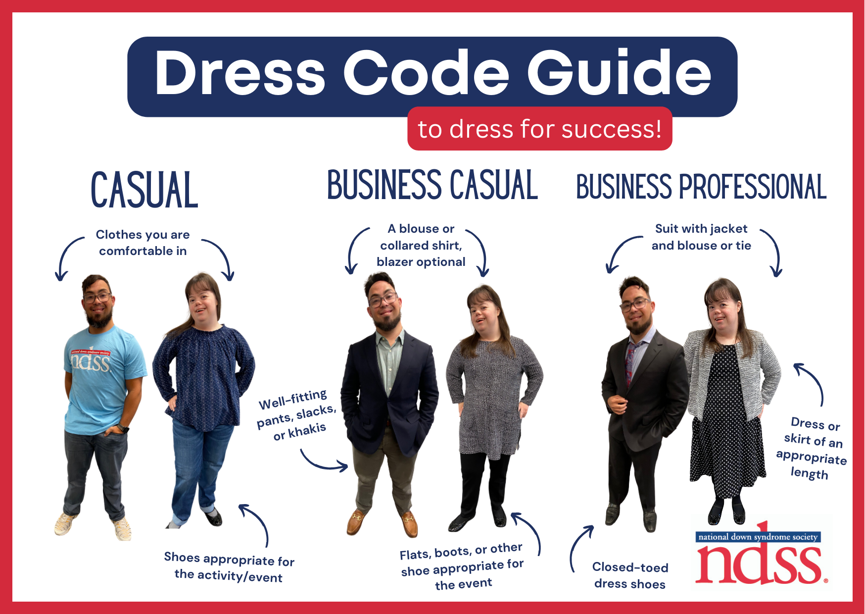 This infographic was designed to help individuals with Down syndrome easily differentiate between casual, business casual, and business attire. This is an ongoing reference tool for navigating various professional settings. It helps individuals with Down syndrome understand the nuances of different dress codes, enabling them to make strong first impressions and dress appropriately for any occasion. Caregivers, job coaches, and teachers can use this guide to provide clear, practical advice and support in preparing for interviews and meeting workplace expectations.