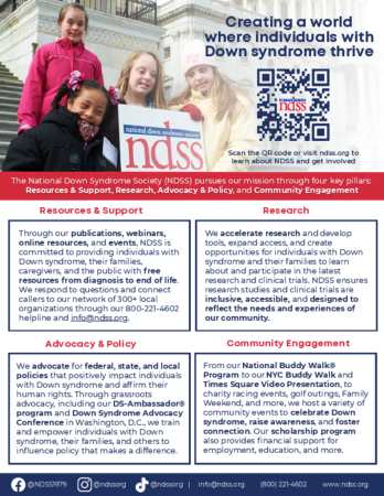 Learn more about the work NDSS does to support the Down syndrome community! File Download NDSS One Pager Please tell us a little about yourself. Email First name Last name City Country - Select - Afghanistan Albania Algeria American Samoa Andorra Angola Anguilla Antarctica Antigua & Barbuda Argentina Armenia Aruba Ascension Island Australia Austria Azerbaijan Bahamas Bahrain Bangladesh Barbados Belarus Belgium Belize Benin Bermuda Bhutan Bolivia Bosnia & Herzegovina Botswana Bouvet Island Brazil British Indian Ocean Territory British Virgin Islands Brunei Bulgaria Burkina Faso Burundi Cambodia Cameroon Canada Canary Islands Cape Verde Caribbean Netherlands Cayman Islands Central African Republic Ceuta & Melilla Chad Chile China Christmas Island Clipperton Island Cocos (Keeling) Islands Colombia Comoros Congo - Brazzaville Congo - Kinshasa Cook Islands Costa Rica Croatia Cuba Curaçao Cyprus Czechia Côte d’Ivoire Denmark Diego Garcia Djibouti Dominica Dominican Republic Ecuador Egypt El Salvador Equatorial Guinea Eritrea Estonia Eswatini Ethiopia Falkland Islands Faroe Islands Fiji Finland France French Guiana French Polynesia French Southern Territories Gabon Gambia Georgia Germany Ghana Gibraltar Greece Greenland Grenada Guadeloupe Guam Guatemala Guernsey Guinea Guinea-Bissau Guyana Haiti Heard & McDonald Islands Honduras Hong Kong SAR China Hungary Iceland India Indonesia Iran Iraq Ireland Isle of Man Israel Italy Jamaica Japan Jersey Jordan Kazakhstan Kenya Kiribati Kosovo Kuwait Kyrgyzstan Laos Latvia Lebanon Lesotho Liberia Libya Liechtenstein Lithuania Luxembourg Macao SAR China Madagascar Malawi Malaysia Maldives Mali Malta Marshall Islands Martinique Mauritania Mauritius Mayotte Mexico Micronesia Moldova Monaco Mongolia Montenegro Montserrat Morocco Mozambique Myanmar (Burma) Namibia Nauru Nepal Netherlands Netherlands Antilles New Caledonia New Zealand Nicaragua Niger Nigeria Niue Norfolk Island Northern Mariana Islands North Korea North Macedonia Norway Oman Outlying Oceania Pakistan Palau Palestinian Territories Panama Papua New Guinea Paraguay Peru Philippines Pitcairn Islands Poland Portugal Puerto Rico Qatar Romania Russia Rwanda Réunion Samoa San Marino Sark Saudi Arabia Senegal Serbia Seychelles Sierra Leone Singapore Sint Maarten Slovakia Slovenia Solomon Islands Somalia South Africa South Georgia & South Sandwich Islands South Korea South Sudan Spain Sri Lanka St. Barthélemy St. Helena St. Kitts & Nevis St. Lucia St. Martin St. Pierre & Miquelon St. Vincent & Grenadines Sudan Suriname Svalbard & Jan Mayen Sweden Switzerland Syria São Tomé & Príncipe Taiwan Tajikistan Tanzania Thailand Timor-Leste Togo Tokelau Tonga Trinidad & Tobago Tristan da Cunha Tunisia Turkmenistan Turks & Caicos Islands Tuvalu Türkiye U.S. Outlying Islands U.S. Virgin Islands Uganda Ukraine United Arab Emirates United Kingdom United States Uruguay Uzbekistan Vanuatu Vatican City Venezuela Vietnam Wallis & Futuna Western Sahara Yemen Zambia Zimbabwe Åland Islands State - None - n/a Alabama Alaska Arizona Arkansas California Colorado Connecticut Delaware District of Columbia Florida Georgia Hawaii Idaho Illinois Indiana Iowa Kansas Kentucky Louisiana Maine Maryland Massachusetts Michigan Minnesota Mississippi Missouri Montana Nebraska Nevada New Hampshire New Jersey New Mexico New York North Carolina North Dakota Ohio Oklahoma Oregon Pennsylvania Rhode Island South Carolina South Dakota Tennessee Texas Utah Vermont Virginia Washington West Virginia Wisconsin Wyoming Is there anything else you want to share about why you're downloading this publication? Leave this field blank