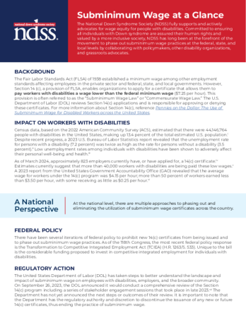 NDSS is committed to advancing competitive integrated employment, vocational training, and self-employment for people with Down syndrome. For further details and to get involved in NDSS’ efforts to eliminate 14(C) and subminimum wage, check out our Ending Subminimum Wage Toolkit - https://ndss.org/ending-subminimum-wage-toolkit.
