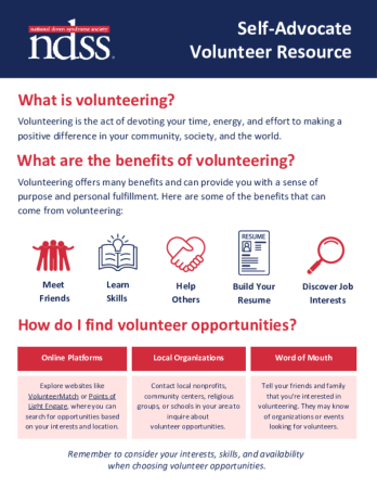 This resource is for self-advocates and provides an introduction to volunteering. Charlotte Woodward, a Programs Associate, helped create this resource to share the benefits of volunteering and encourage others to get involved in their communities.